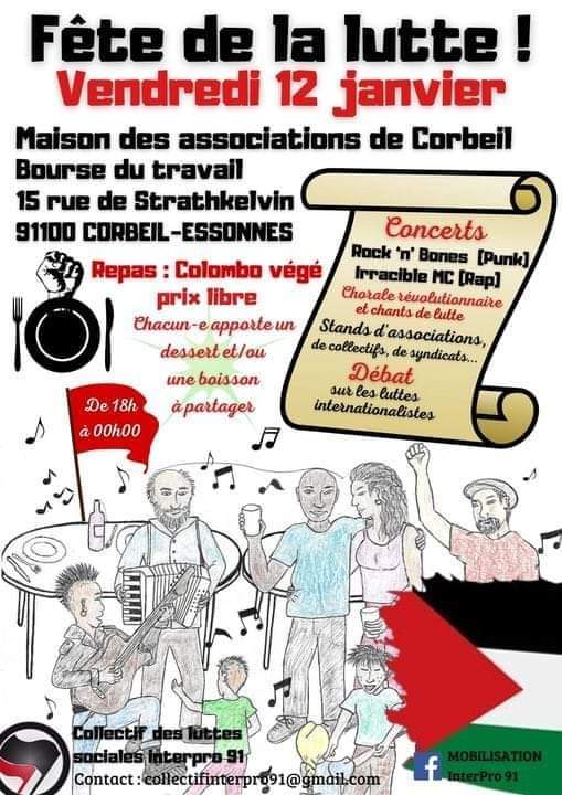 12 janvier 2024 – Fête de la lutte Publié 20 décembre 20238 janvier 2024 Par solidaires91 dans Évènements 18h – Minuit à la Bourse du Travail de Corbeil-Essonnes, 15 rue de Strathkelvin. Repas à prix libre et concerts. Partager : Partager sur X(ouvre dans une nouvelle fenêtre) X Partager sur Facebook(ouvre dans une nouvelle fenêtre) Facebook J’aime chargement… Similaire Publié par solidaires91 Voir tous les articles par solidaires91