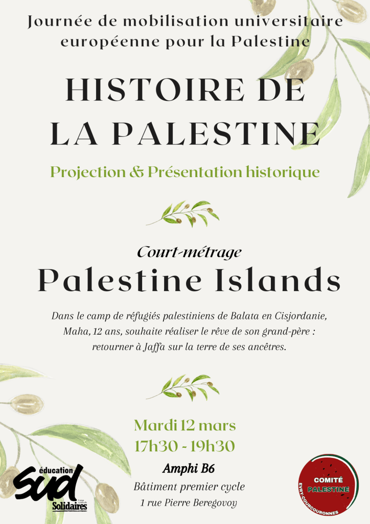 Dans le cadre de la journée de mobilisation universitaire européenne pour la Palestine, le comité étudiant de soutien à la Palestine d’Evry-Courcouronnes, soutenu par SUD Éducation 91, organise une projection du court métrage : Palestine Islands.