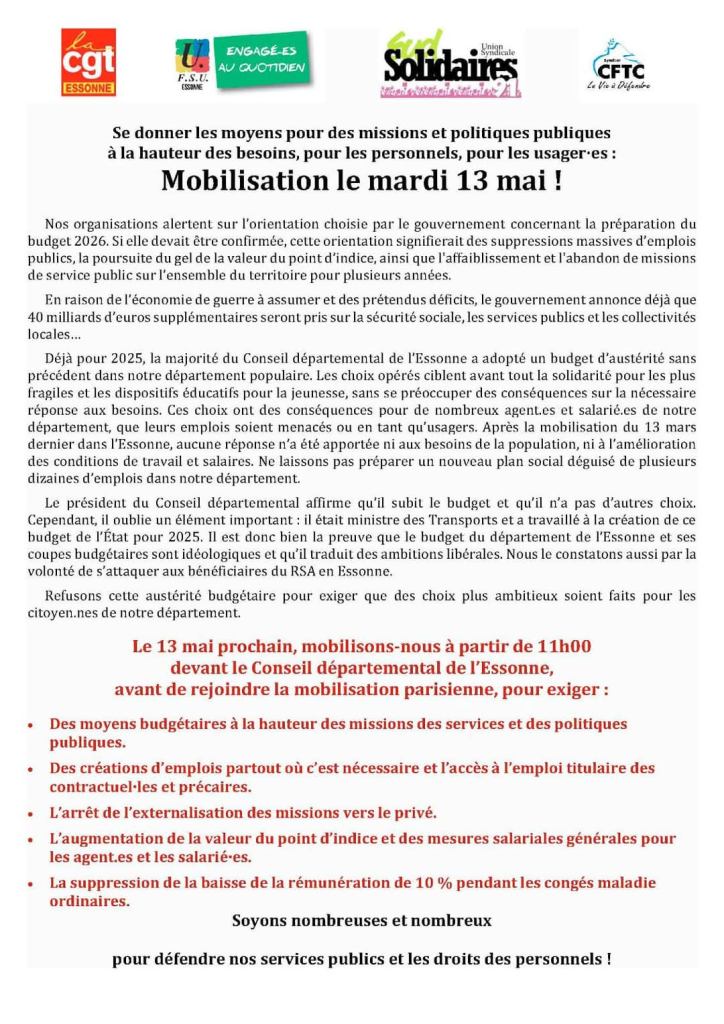 En Essonne, l’intersyndicale départementale appelle à se rassembler à 11h devant le conseil départemental, puis à manifester à 14h à Paris !