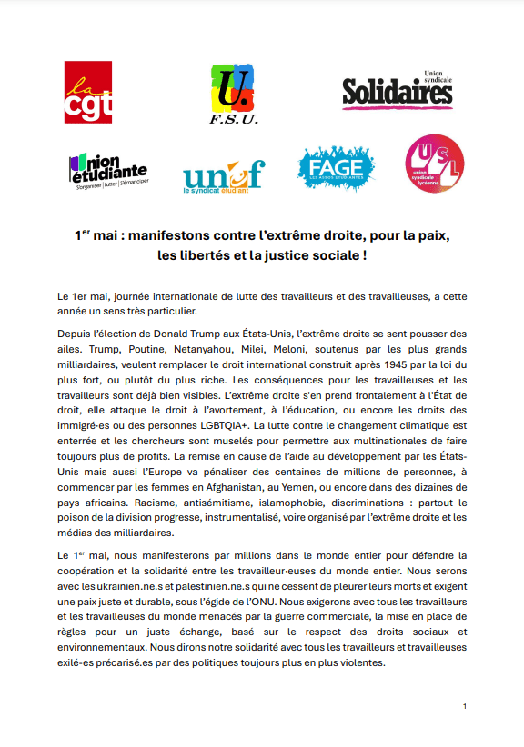 • Nous organiserons des mobilisations unitaires contre l’extrême droite, notamment en pérennisant et en popularisant notre initiative du 8 mai antifasciste, lancée pour la première fois en 2024 ;