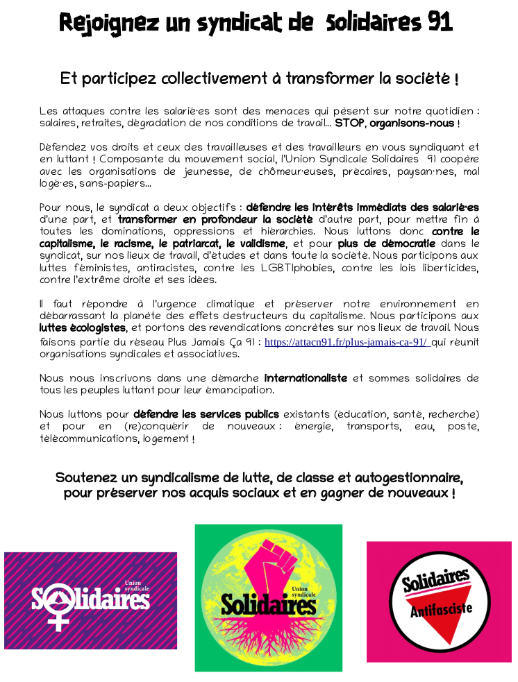 Bienvenue sur le site de l’Union Syndicale Solidaires 91. Vous y trouverez des informations sur les syndicats membres de l’union syndicale Solidaires présents en Essonne, et sur les mobilisations en cours dans le département.