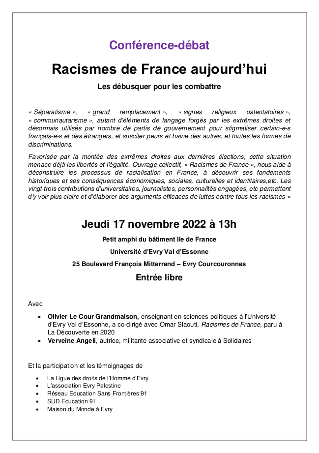 17 novembre 2022 – Conférence « Racismes de France aujourd’hui » Publié 16 novembre 202211 avril 2024 Par solidaires91 dans Évènements, Document flyer-conference-17-novembreTélécharger