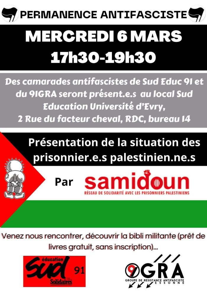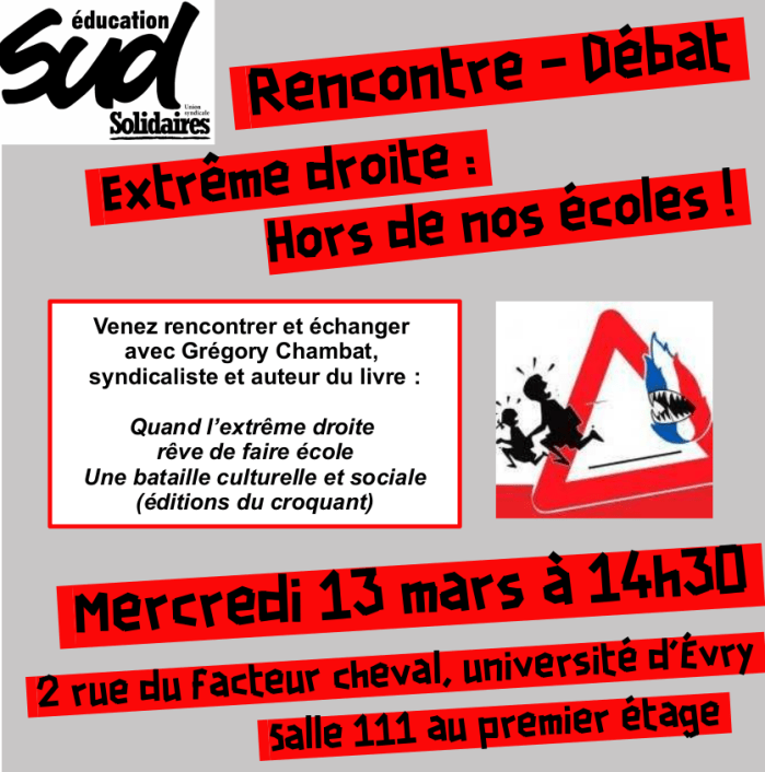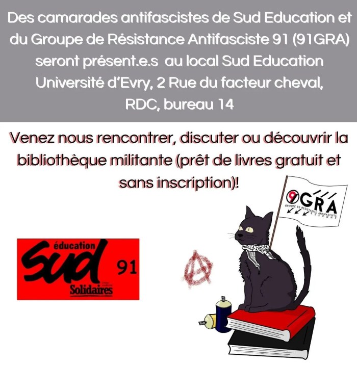 Des camarades antifascistes de SUD Éducation et du Groupe de Résistance Antifasciste 91 seront présent·es au local SUD de l’Université d’Évry, 2 rue du facteur cheval, RDC, bureau 14.