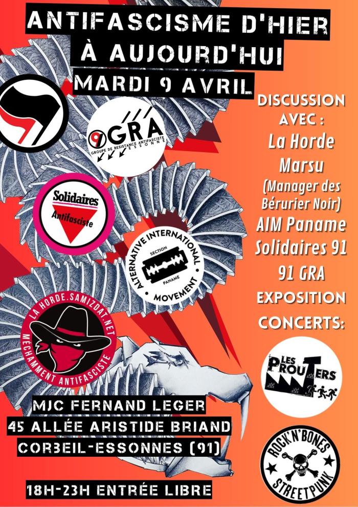 Discussion avec le collectif La Horde, Marsu (manager des Béruriers noirs), l’AIM Paname, Solidaires 91 et le 91GRA. Puis concerts des Prouters et des Rock’n’bones.
