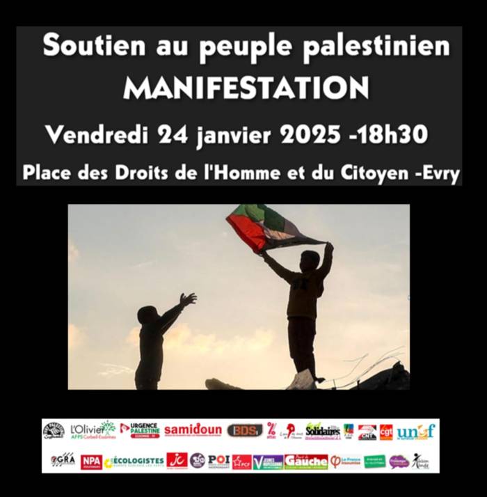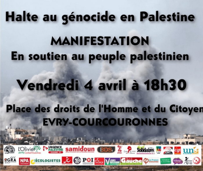 Manifestation de soutien au peuple Palestinien, à Évry vendredi 16 mai à partir de 18h30.